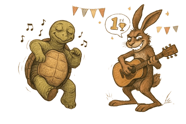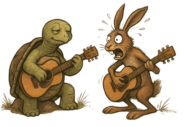 Imagine the tortoise and the hare are each learning the guitar with zero prior music experience outside of listening to it.