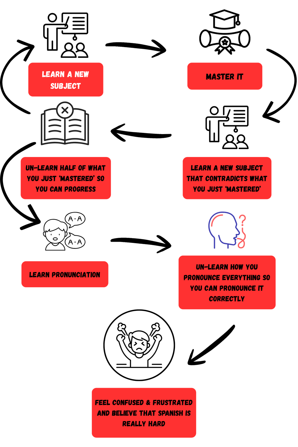 watching shows in Spanish with subtitles, talking with Spanish speakers as often as I could, reading children's books, following YouTube Spanish gurus...but the further I went in, the more confused I came out